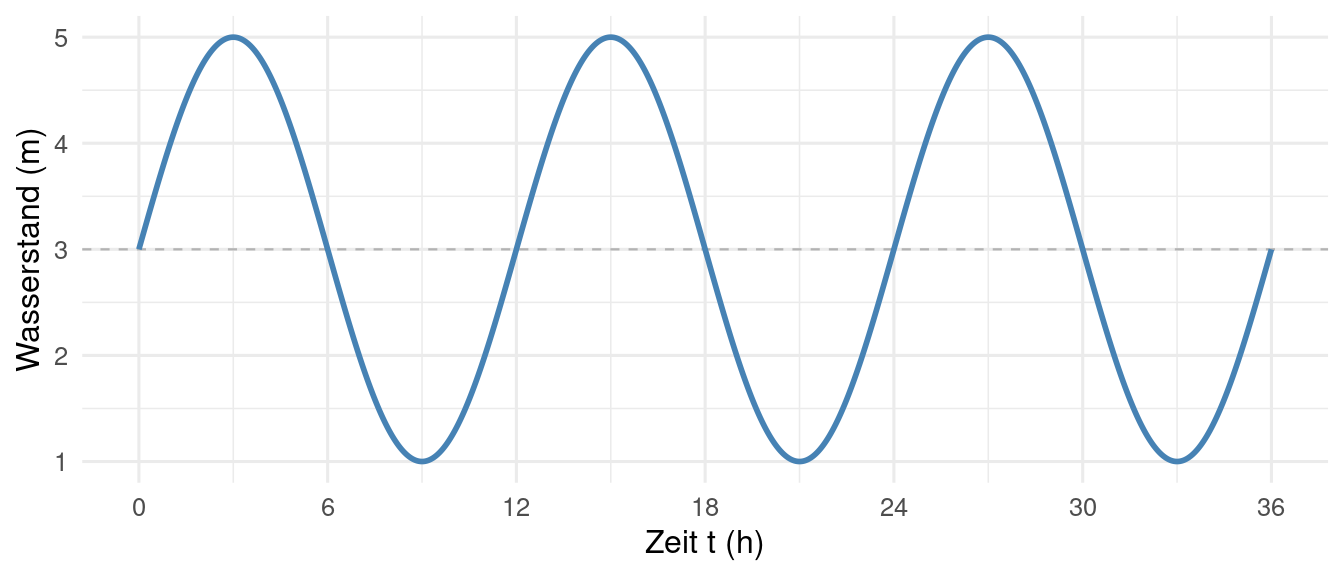 Der Wasserstand im Hafen schwankt periodisch: Maximum , Minimum , Periode . Zum Zeitpunkt befindet sich der Wasserstand auf der Mittellage und steigt.