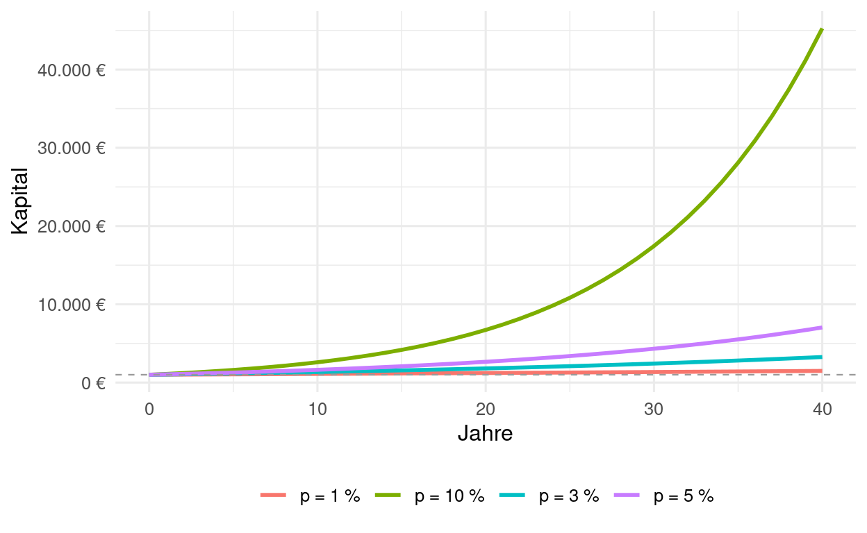 Bei linearem Wachstum wird in gleichen Zeitabschnitten immer derselbe Betrag addiert (konstante absolute Änderung):