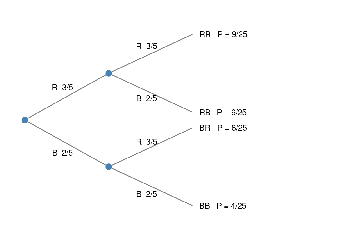 Urne mit 3 roten (R) und 2 blauen (B) Kugeln. Zweimal ziehen ohne Zurücklegen.