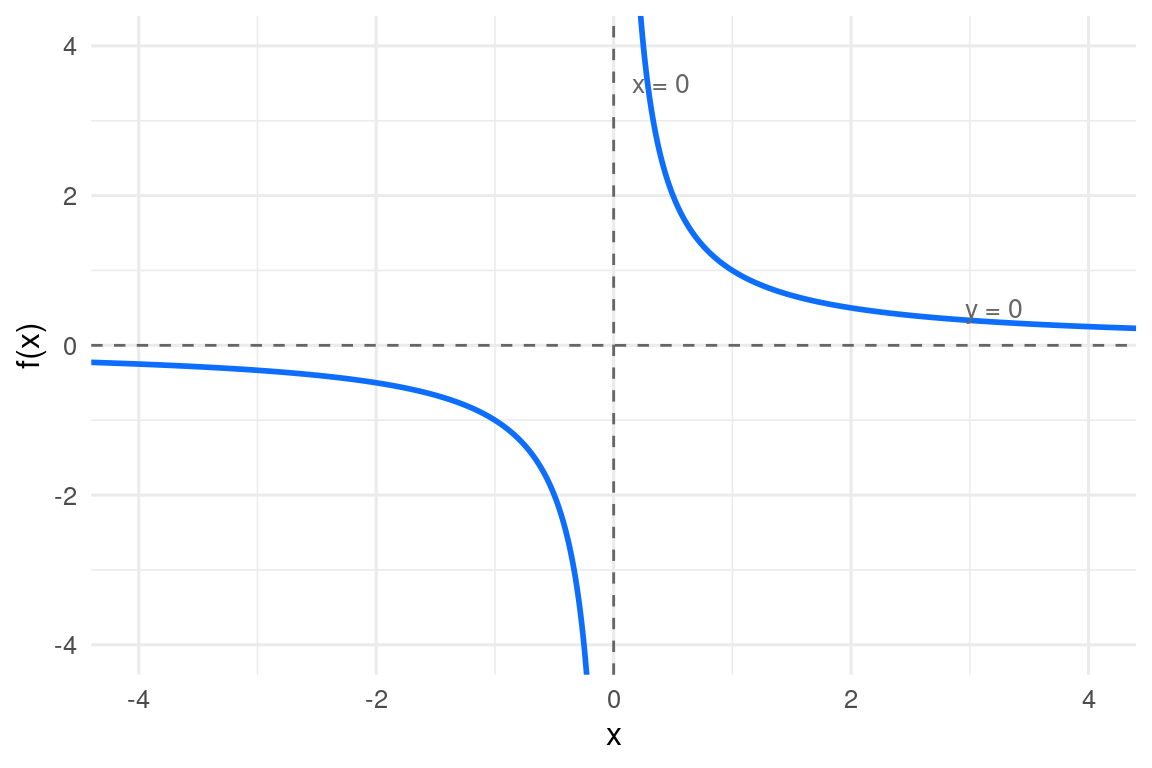 Auffällig: Der Graph nähert sich den Koordinatenachsen immer mehr an, ohne sie zu berühren — die Achsen sind Asymptoten. An der Stelle ist nicht definiert — dort liegt eine Polstelle.