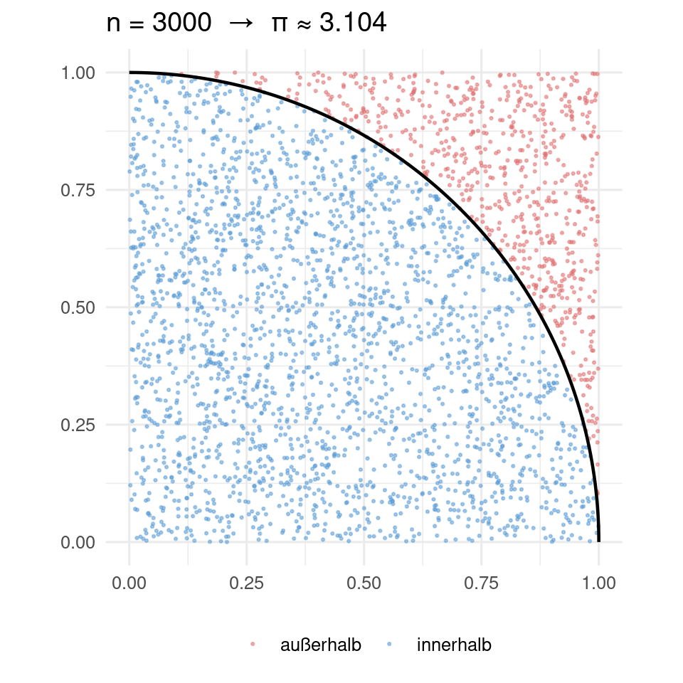Idee: Zufällige Punkte mit werden generiert. Der Anteil der Punkte, die innerhalb des Viertelkreises mit Radius 1 liegen (), nähert sich .